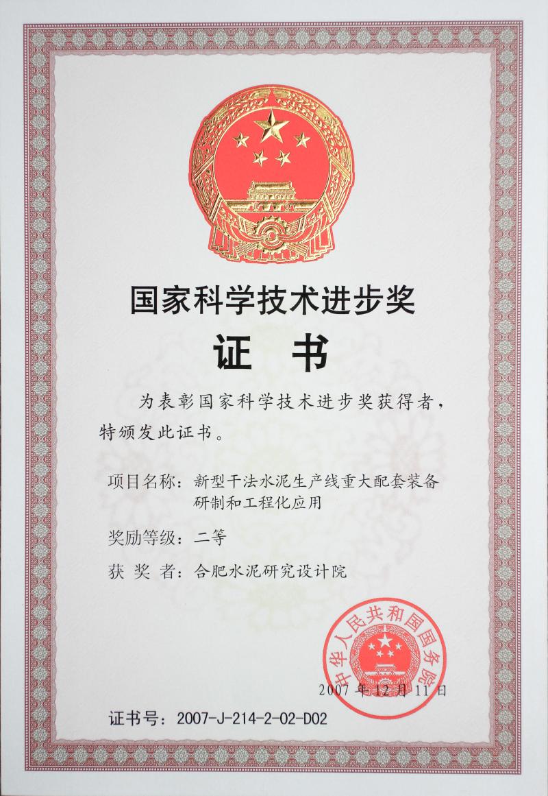 2007年,《大型新型干法水泥生產(chǎn)線配套裝備研制與應(yīng)用》獲得國家科技進(jìn)步二等獎(jiǎng)。這是該年度我國建材行業(yè)唯一獲得國家科技進(jìn)步獎(jiǎng)的項(xiàng)目。