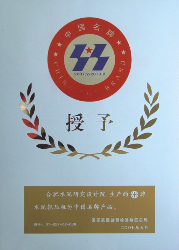 2007年9月11日,合肥院HFCG系列輥壓機(jī)產(chǎn)品榮獲“中國名牌產(chǎn)品”稱號(hào),開創(chuàng)了建材行業(yè)科研院所自主研發(fā)和制造的產(chǎn)品獲“中國名牌”的先河